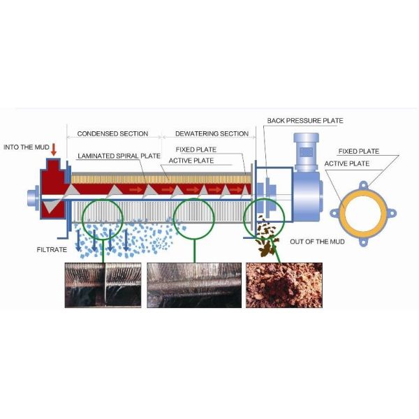 Volute sludge dewatering works by the machine’s internal pressure and needs no large scale